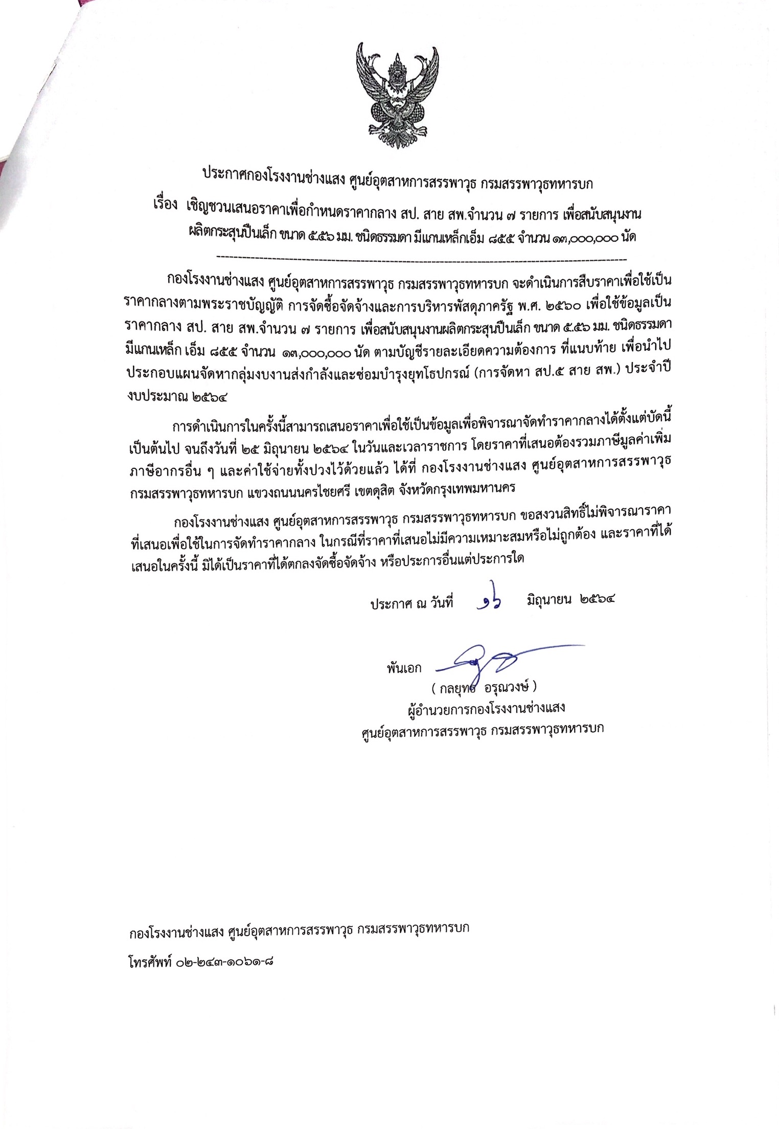 เรื่อง เชิญชวนเสนอราคาเพื่อกำหนดราคากลาง สป. สาย สพ.จำนวน ๗ รายการ เพื่อสนับสนุนงานผลิตกระสุนปืนเล็ก ขนาด ๕.๕๖ มม. ชนิดธรรมดา มีแกนเหล็กเอ็ม ๘๕๕ จำนวน ๑๓,๐๐๐,๐๐๐ นัด