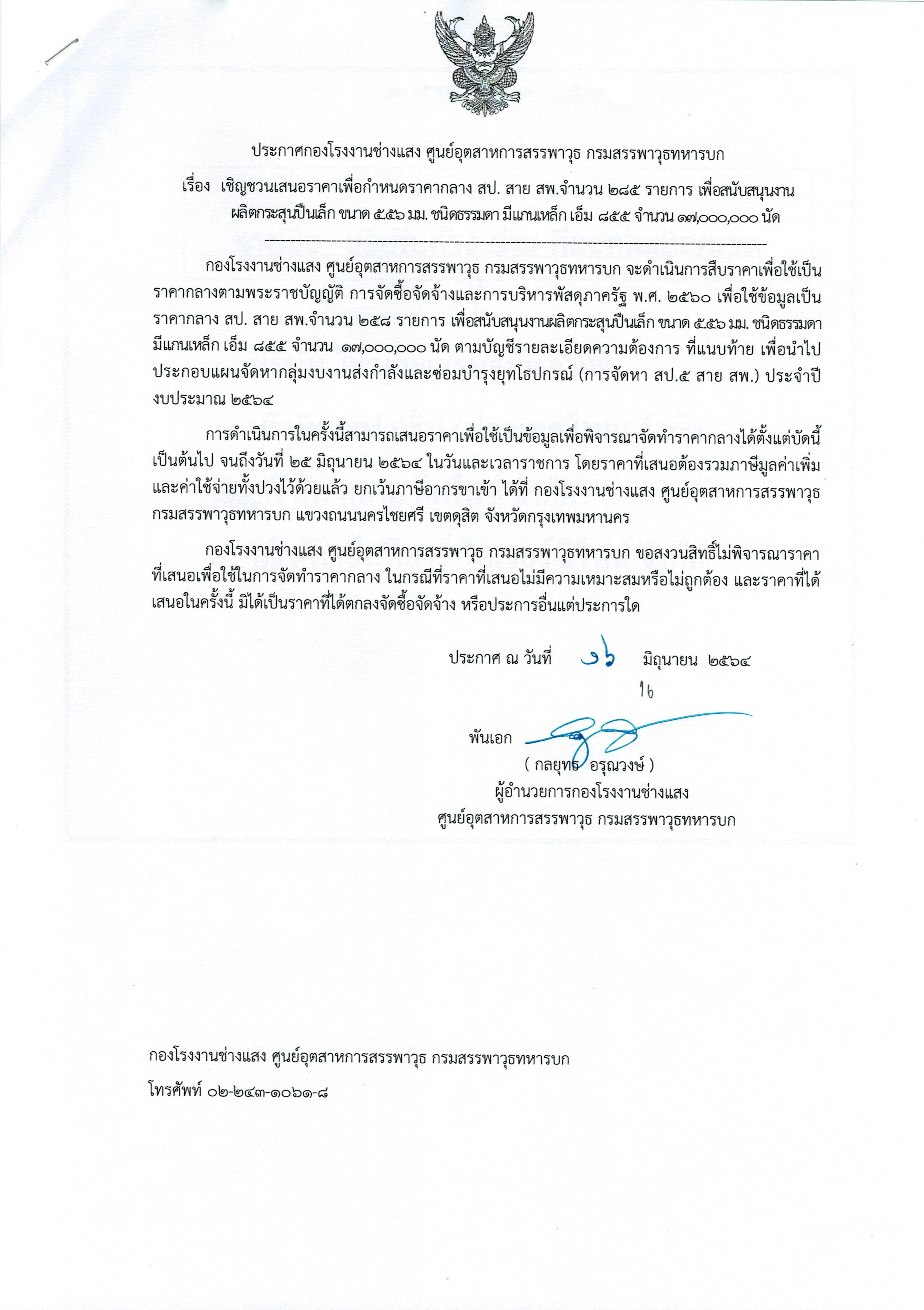 เรื่อง เชิญชวนเสนอราคาเพื่อกำหนดราคากลาง สป. สาย สพ.จำนวน ๒๘๕ รายการ เพื่อสนับสนุนงาน ผลิตกระสุนปืนเล็ก ขนาด ๕.๕๖ มม. ชนิดธรรมดา มีแกนเหล็ก เอ็ม ๘๕๕ จำนวน ๑๗,๐๐๐,๐๐๐ นัด