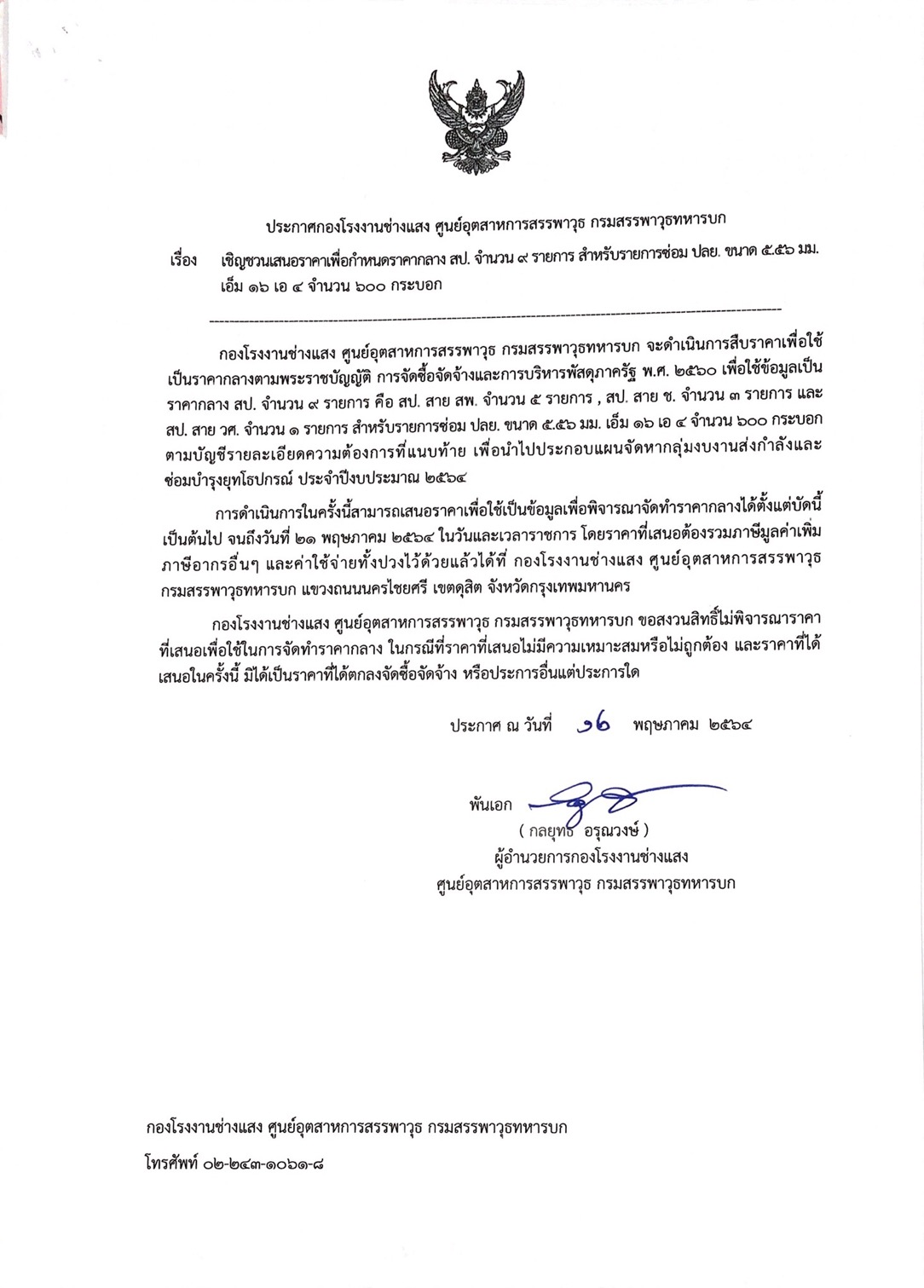 เรื่อง เรื่อง เชิญชวนเสนอราคาเพื่อกำหนดราคากลางสิ่งอุปกรณ์ จำนวน ๙ รายการ สำหรับรายการซ่อม ปลย. ขนาด ๕.๕๖ มม. เอ็ม ๑๖ เอ ๔ จำนวน ๖๐๐ กระบอก