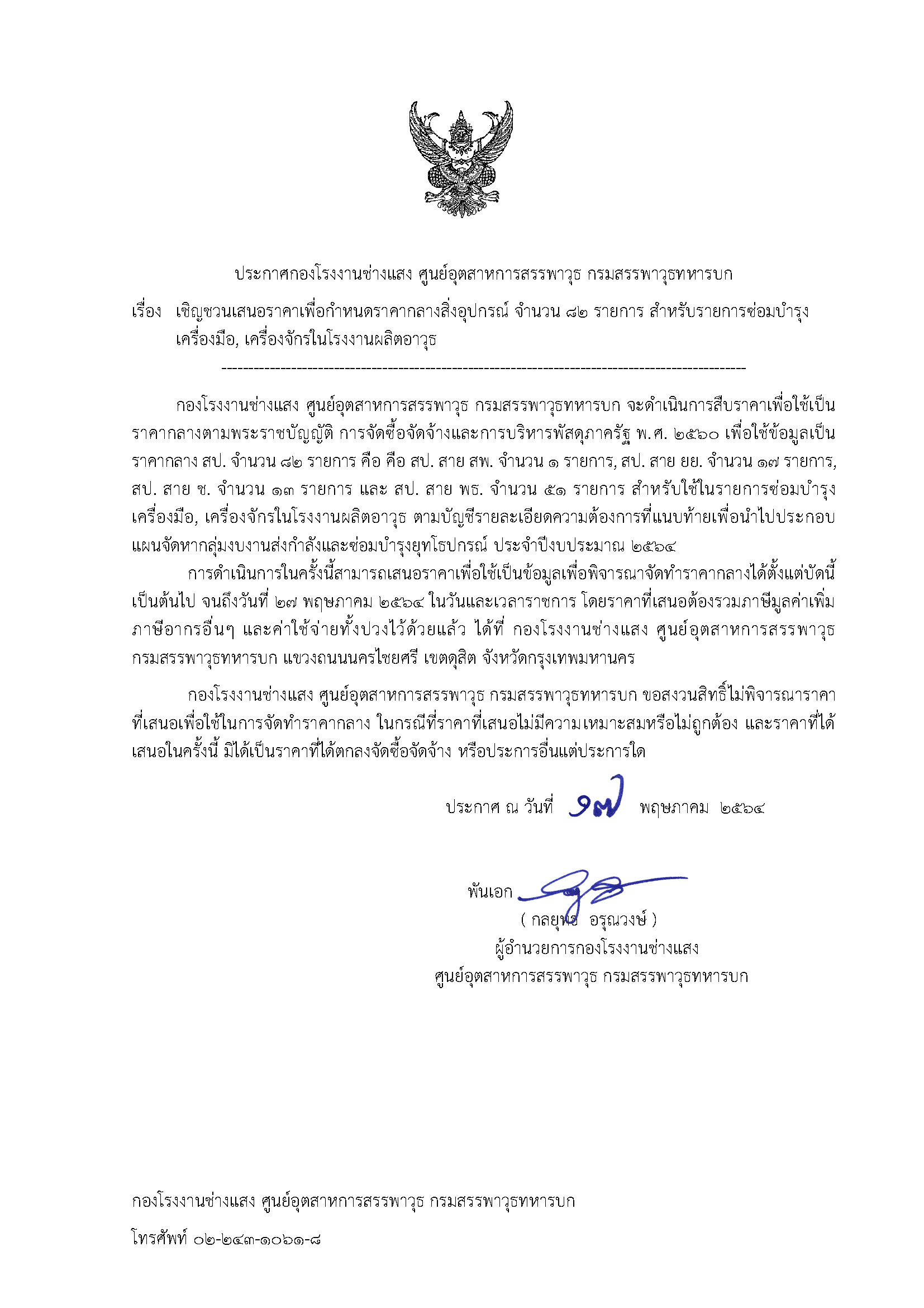 เรื่อง เรื่อง เชิญชวนเสนอราคาเพื่อกำหนดราคากลางสิ่งอุปกรณ์ จำนวน ๘๒ รายการ สำหรับรายการซ่อมบำรุงเครื่องมือ, เครื่องจักรในโรงงานผลิตอาวุธ