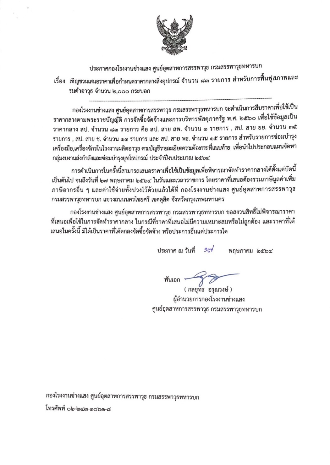 เรื่อง เรื่อง เชิญชวนเสนอราคาเพื่อกำหนดราคากลางสิ่งอุปกรณ์ จำนวน ๘๓ รายการ สำหรับรายการฟื้นฟูสภาพและรมดำอาวุธ จำนวน ๒,๐๐๐ กระบอก