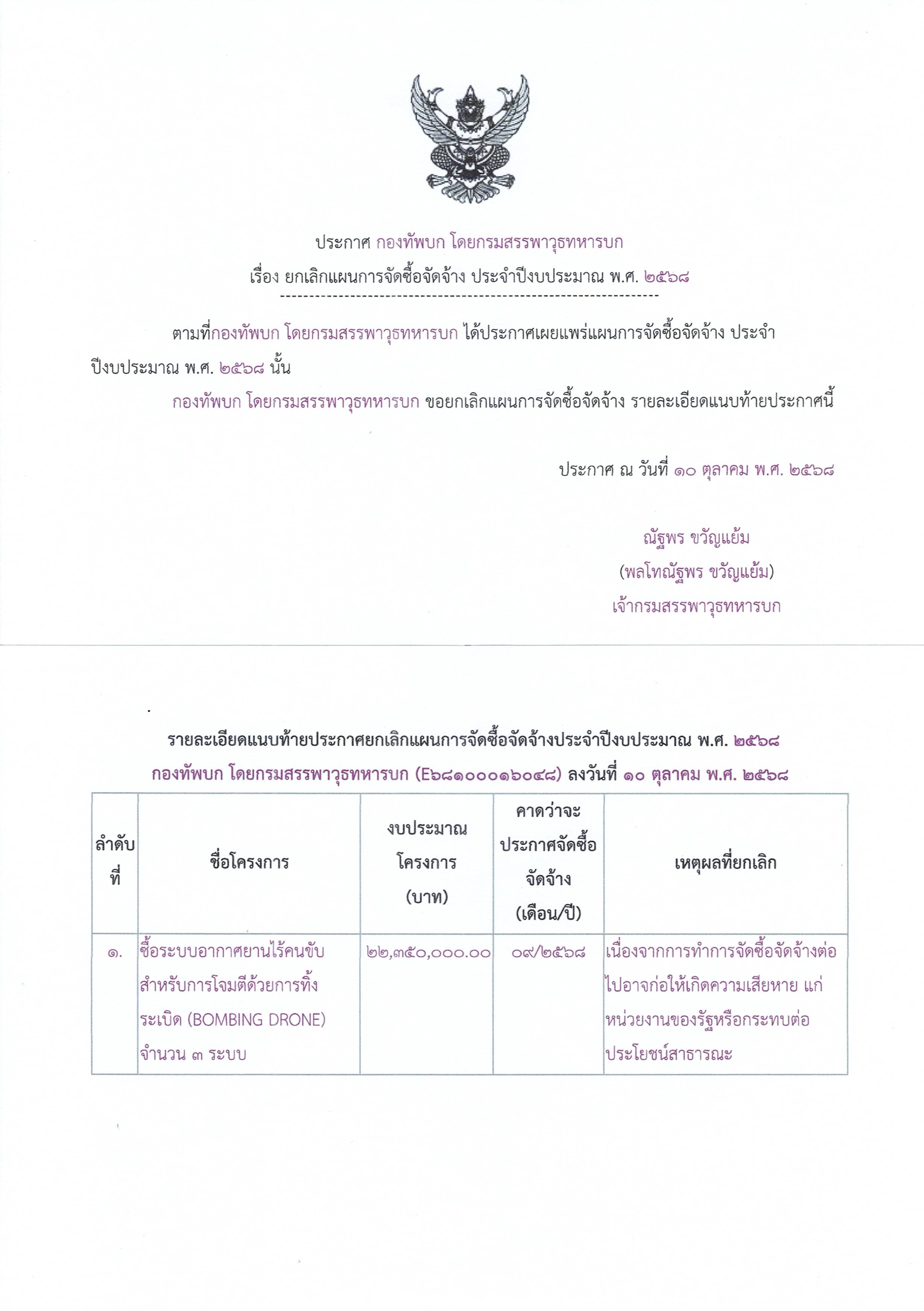 เรื่อง ยกเลิกแผนการจัดซื้อจัดจ้าง ประจำปีงบประมาณ พ.ศ. ๒๕๖๘ เรื่อง ซื้อระบบอากาศยานไร้คนขับสำหรับการโจมตีด้วยการทิ้งระเบิด (BOMBING DRONE) จำนวน ๓ ระบบ โดยวิธีเฉพาะเจาะจง