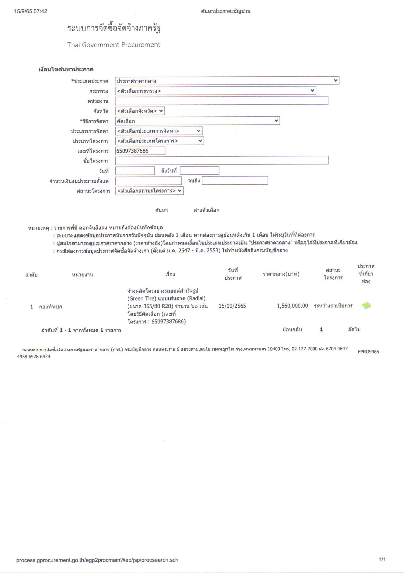 ๑. ชื่อโครงการ จ้างผลิตโครงยางรถยนต์สำเร็จรูป (Green Tire) แบบเส้นลวด (Radial) (ขนาด 365/80 R20) จำนวน ๖๐ เส้น