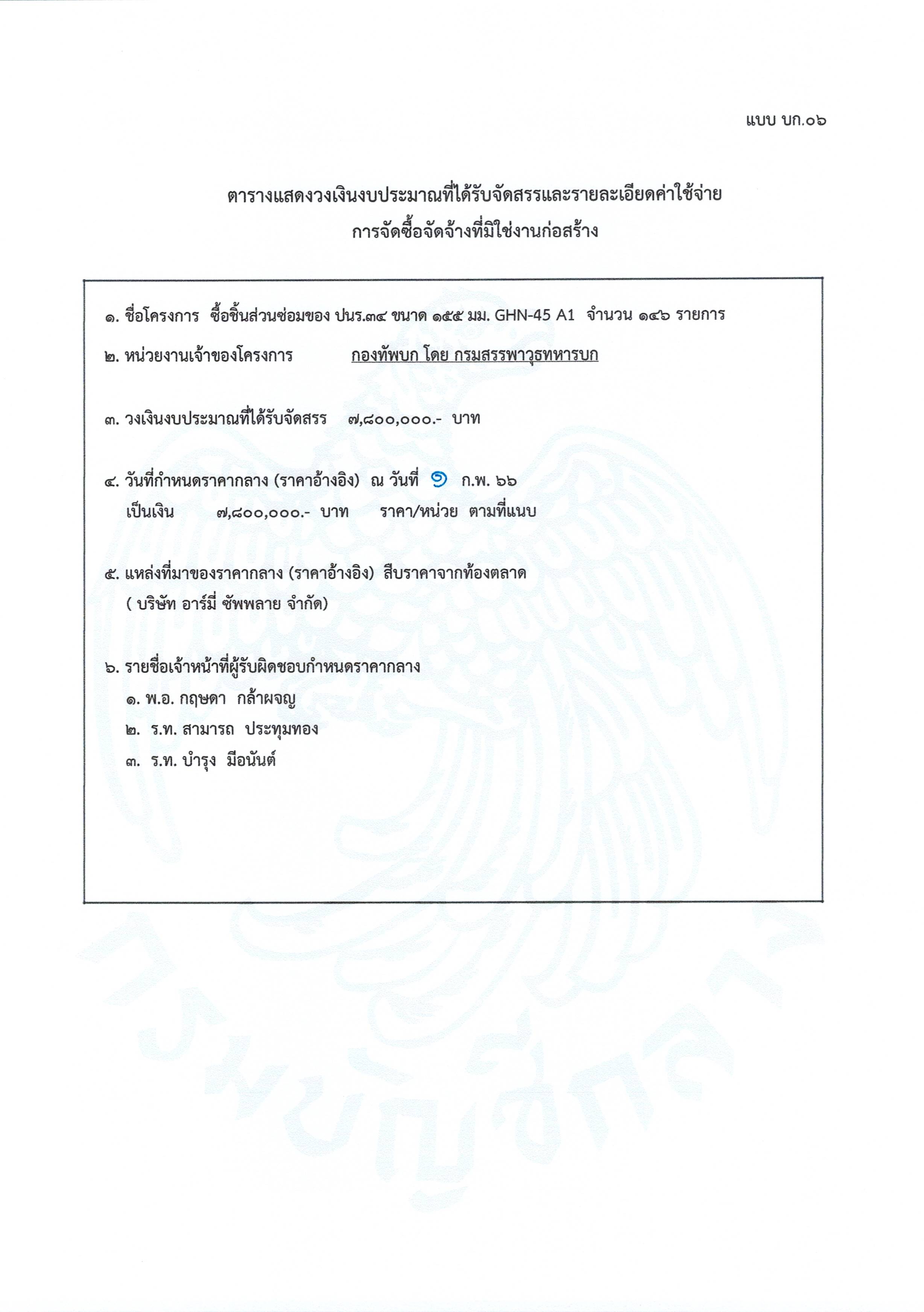 เรื่อง ตารางแสดงวงเงินงบประมาณที่ได้รับจัดสรรและรายละเอียดค่าใช้จ่าย การจัดซื้อจัดจ้างที่มิใช่งานก่อสร้าง เรือง ซื้อชิ้นส่วนซ่อมของ ปนร.๓๔ ขนาด ๑๕๕ มม. GHN-45 A1 จำนวน ๑๔๖ รายการ