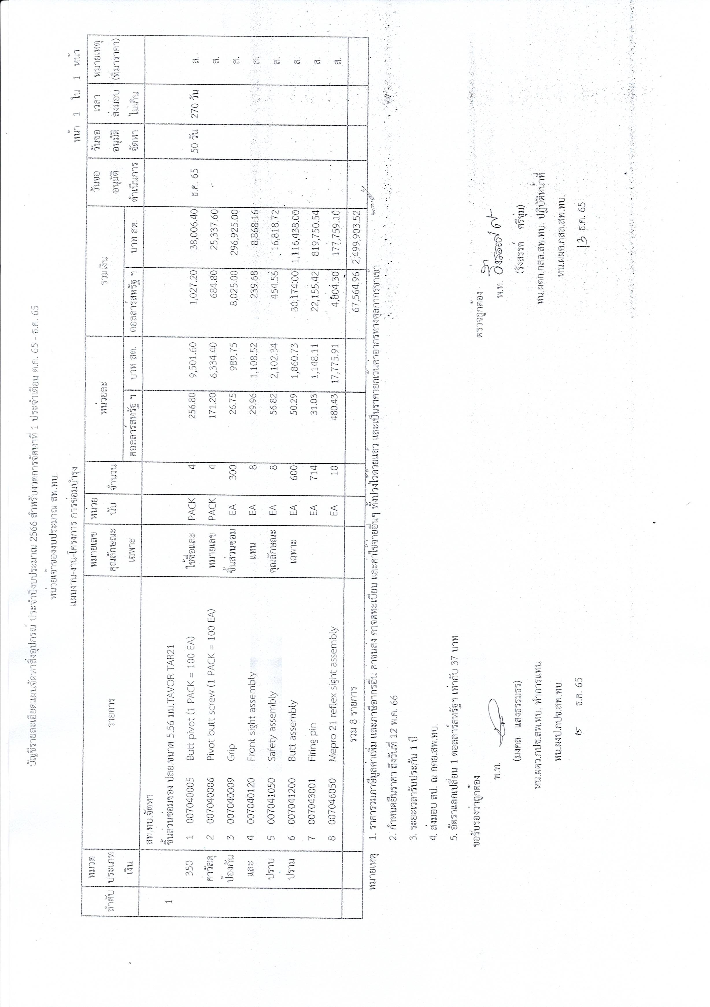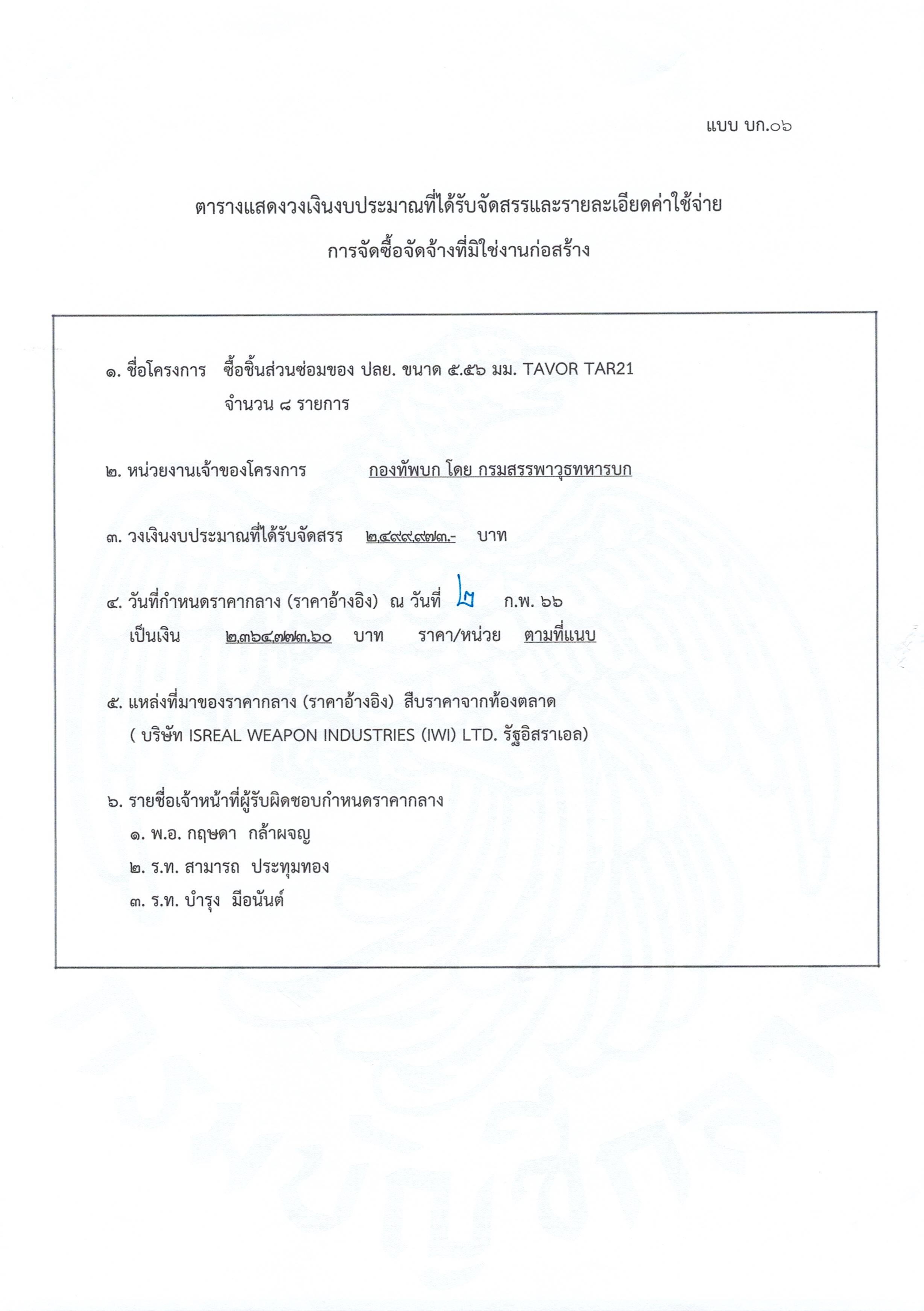 เรื่อง ตารางแสดงวงเงินงบประมาณที่ได้รับจัดสรรและรายละเอียดค่าใช้จ่าย การจัดซื้อจัดจ้างที่มิใช่งานก่อสร้าง เรือง ชิ้นส่วนซ่อมของ ปลย. ขนาด ๕.๕๖ มม. TAVOR TAR21 จำนวน ๘ รายการ