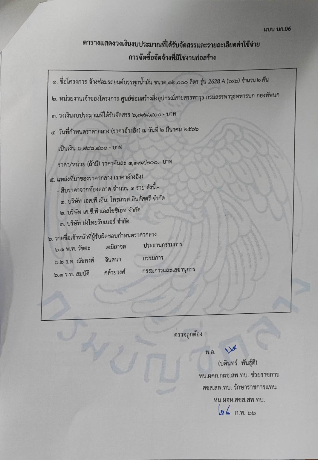 ๖. รายชื่อเจ้าหน้าที่ผู้รับผิดชอบกำหนดราคากลาง