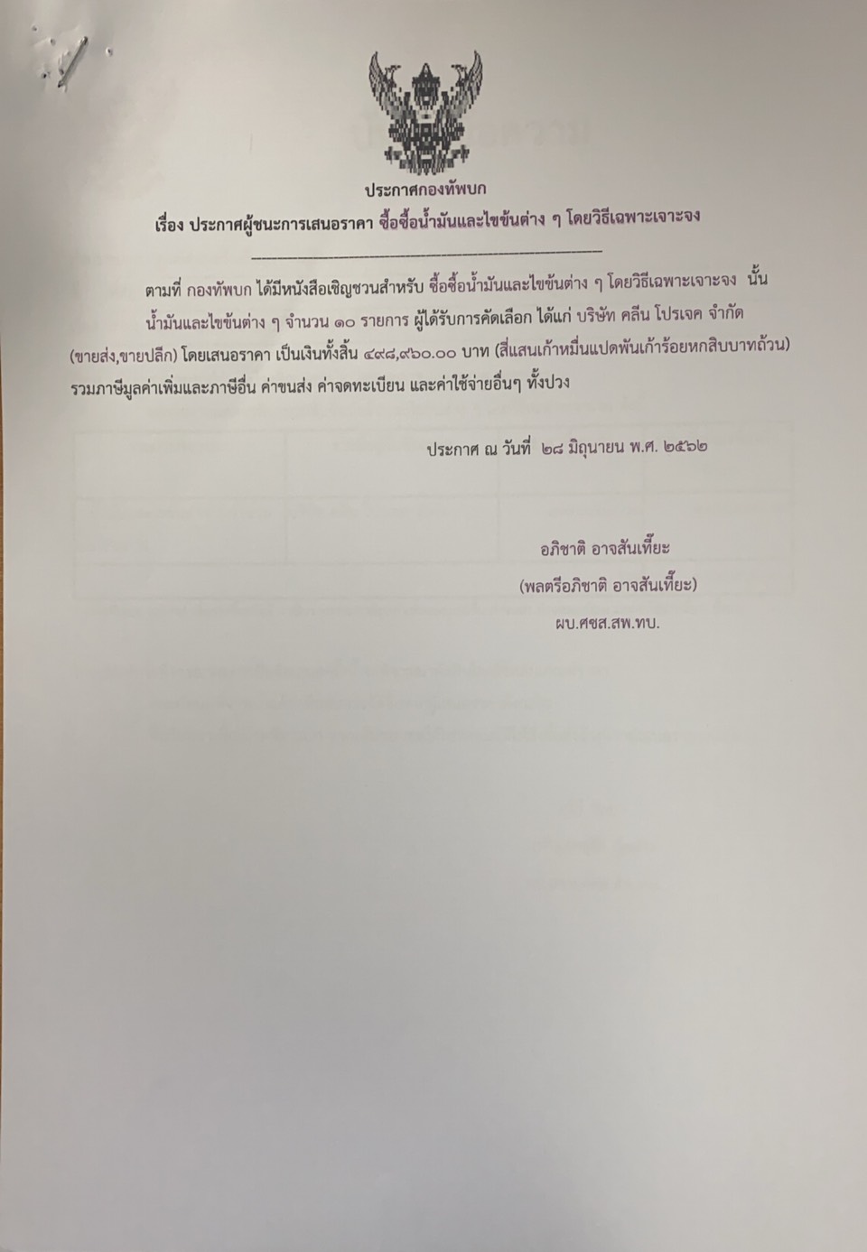 ตามที่ กองทัพบก ได้มีหนังสือเชิญชวนสำหรับ ซื้อซื้อน้ำมันและไขข้นต่าง ๆ โดยวิธีเฉพาะเจาะจง นั้น