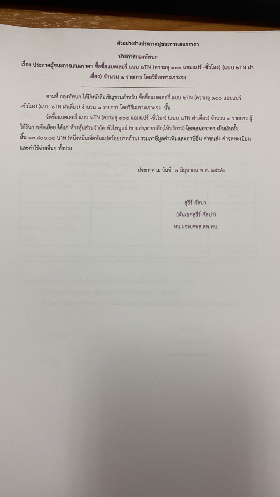 ตามที่ กองทัพบก ได้มีหนังสือเชิญชวนสำหรับ ซื้อซื้อแบตเตอรี่ แบบ ๖TN (ความจุ ๑๐๐ แอมแปร์ -ชั่วโมง) (แบบ ๖TN ฝาเดี่ยว) จำนวน ๑ รายการ โดยวิธีเฉพาะเจาะจง นั้น