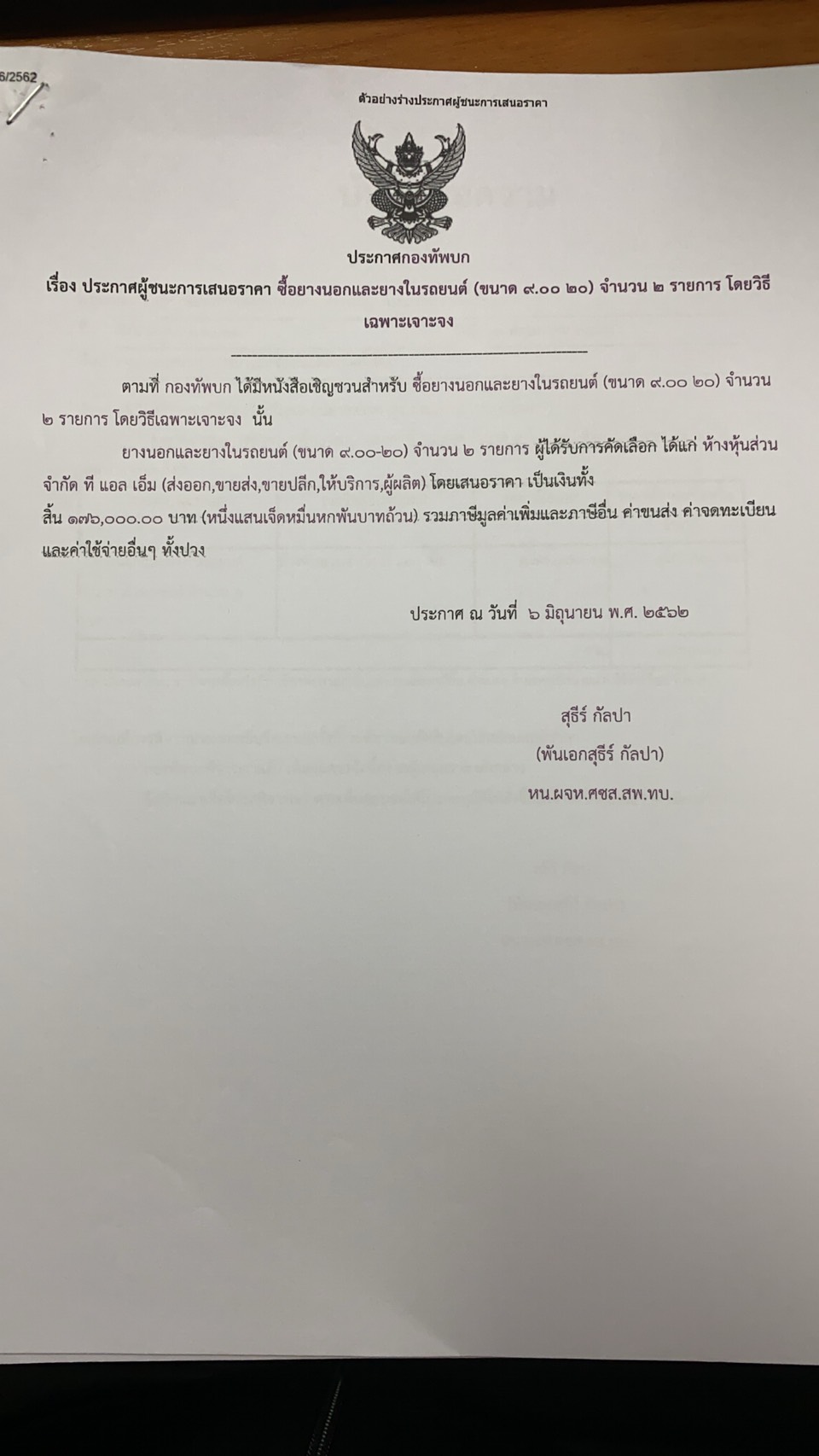 ยางนอกและยางในรถยนต์ (ขนาด ๙.๐๐-๒๐) จำนวน ๒ รายการ ผู้ได้รับการคัดเลือก ได้แก่ห้างหุ้นส่วนจำกัด ที แอล เอ็ม (ส่งออก,ขายส่ง,ขายปลีก,ให้บริการ,ผู้ผลิต) โดยเสนอราคา เป็นเงินทั้งสิ้น ๑๗๖,๐๐๐.๐๐ บาท (หนึ่งแสนเจ็ดหมื่นหกพันบาทถ้วน) รวมภาษีมูลค่าเพิ่มและภาษีอื่น ค่าขนส่ง ค่าจดทะเบียน และค่าใช้จ่ายอื่นๆ ทั้งปวง