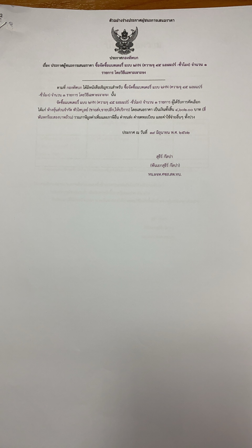 จัดซื้อแบตเตอรี่ แบบ ๒HN (ความจุ ๔๕ แอมแปร์ -ชั่วโมง) จำนวน ๑ รายการ ผู้ได้รับการคัดเลือก ได้แก่ ห้างหุ้นส่วนจำกัด พัวไพบูลย์ (ขายส่ง,ขายปลีก,ให้บริการ) โดยเสนอราคา เป็นเงินทั้งสิ้น ๔,๖๐๒.๐๐ บาท (สี่พันหกร้อยสองบาทถ้วน) รวมภาษีมูลค่าเพิ่มและภาษีอื่น ค่าขนส่ง ค่าจดทะเบียน และค่าใช้จ่ายอื่นๆ ทั้งปวง