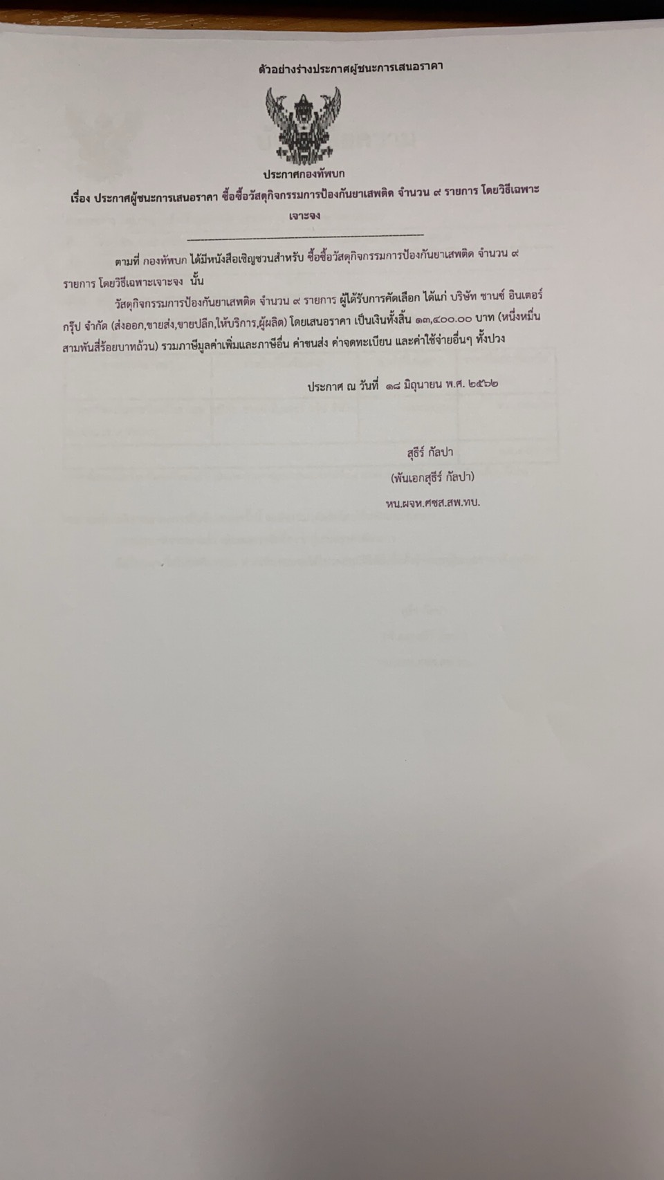 วัสดุกิจกรรมการป้องกันยาเสพติด จำนวน ๙ รายการ ผู้ได้รับการคัดเลือก ได้แก่ บริษัท ชานซ์ อินเตอร์ กรุ๊ป จำกัด (ส่งออก,ขายส่ง,ขายปลีก,ให้บริการ,ผู้ผลิต) โดยเสนอราคา เป็นเงินทั้งสิ้น ๑๓,๔๐๐.๐๐ บาท (หนึ่งหมื่นสามพันสี่ร้อยบาทถ้วน) รวมภาษีมูลค่าเพิ่มและภาษีอื่น ค่าขนส่ง ค่าจดทะเบียน และค่าใช้จ่ายอื่นๆ ทั้งปวง
