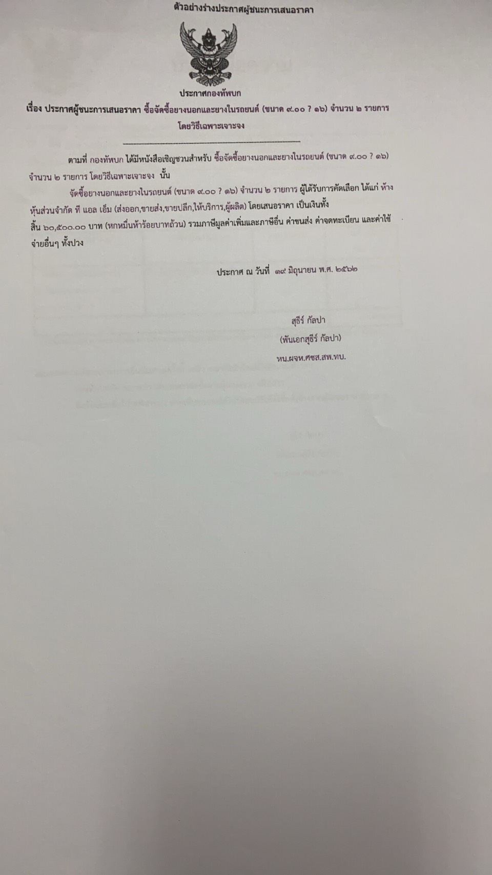 ตามที่ กองทัพบก ได้มีหนังสือเชิญชวนสำหรับ ซื้อจัดซื้อยางนอกและยางในรถยนต์ (ขนาด ๙.๐๐ - ๑๖) จำนวน ๒ รายการ โดยวิธีเฉพาะเจาะจง นั้น