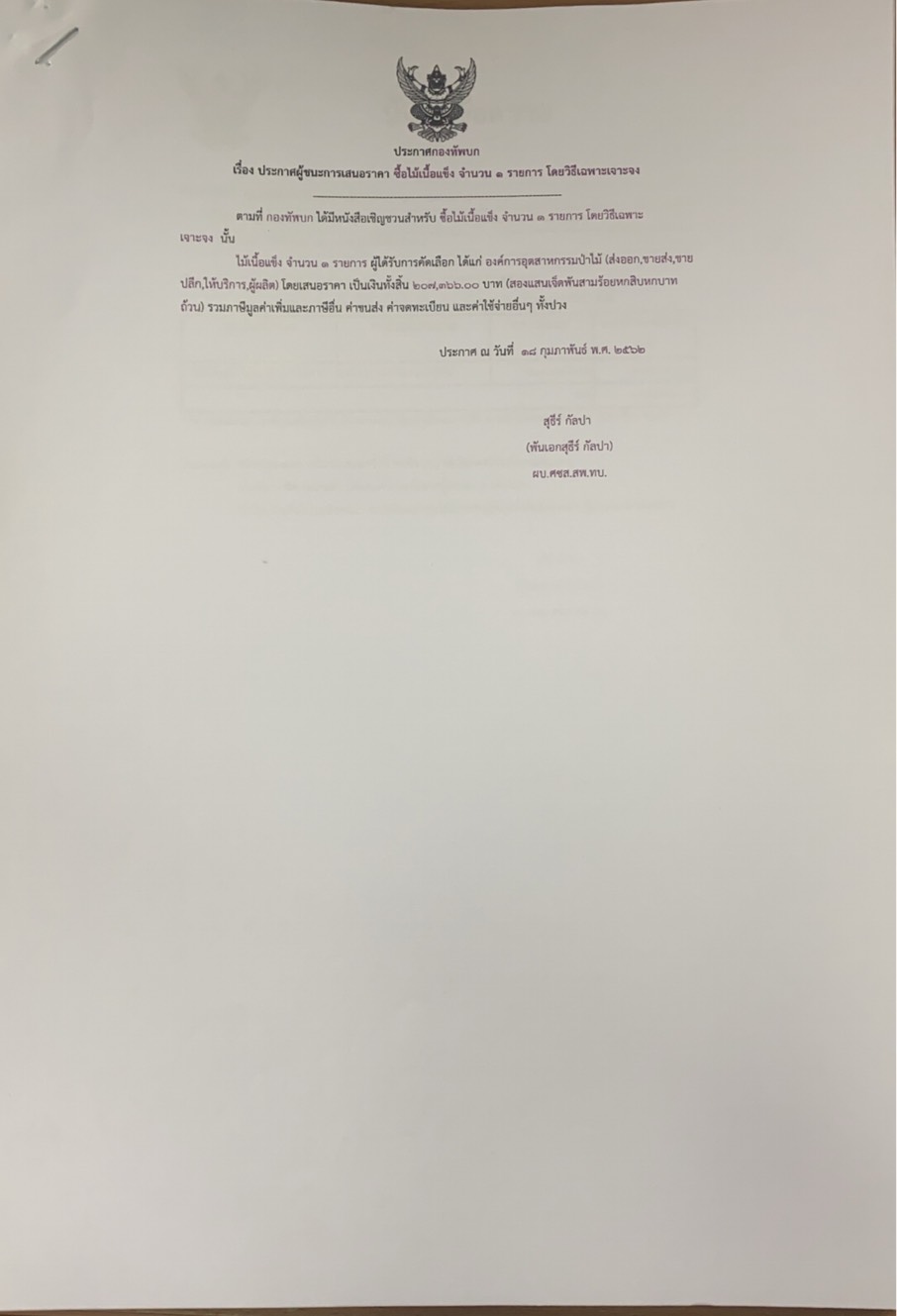 ตามที่ กองทัพบก ได้มีหนังสือเชิญชวนสำหรับ ซื้อไม้เนื้อแข็ง จำนวน ๑ รายการ โดยวิธีเฉพาะเจาะจง นั้น