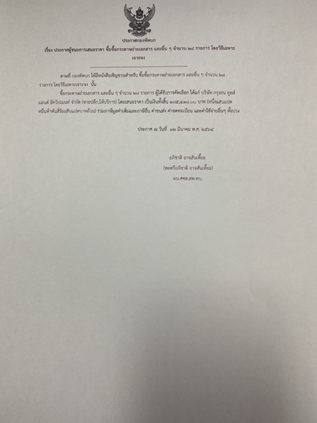 ตามที่ กองทัพบก ได้มีหนังสือเชิญชวนสำหรับ ซื้อซื้อกระดาษถ่ายเอกสาร และอื่น ๆ จำนวน ๒๘ รายการ โดยวิธีเฉพาะเจาะจง นั้น