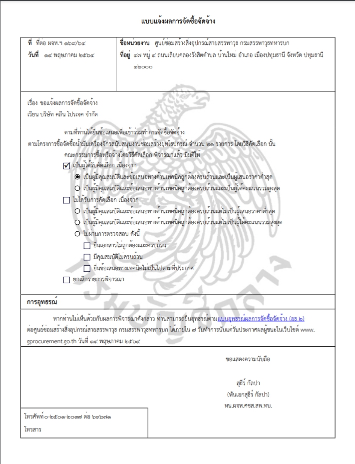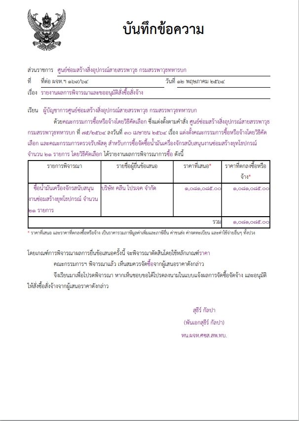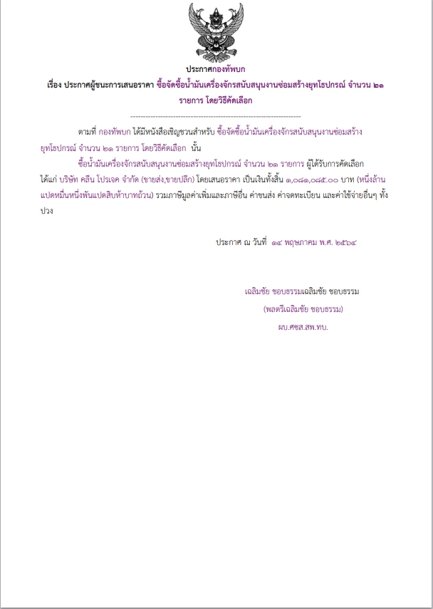 ซื้อน้ำมันเครื่องจักรสนับสนุนงานซ่อมสร้างยุทโธปกรณ์ จำนวน ๒๑ รายการ ผู้ได้รับการคัดเลือก ได้แก่ บริษัท คลีน โปรเจค จำกัด (ขายส่ง,ขายปลีก) โดยเสนอราคา เป็นเงินทั้งสิ้น ๑,๐๘๑,๐๘๕.๐๐ บาท (หนึ่งล้านแปดหมื่นหนึ่งพันแปดสิบห้าบาทถ้วน) รวมภาษีมูลค่าเพิ่มและภาษีอื่น ค่าขนส่ง ค่าจดทะเบียน และค่าใช้จ่ายอื่นๆ ทั้งปวง