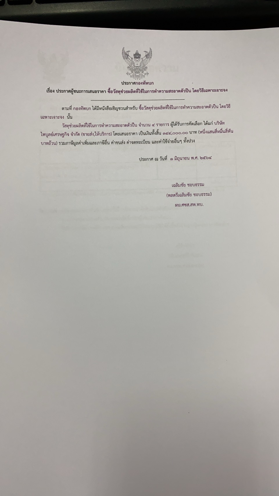 วัสดุช่วยผลิตที่ใช้ในการทำความสะอาดตัวปืน จำนวน ๔ รายการ ผู้ได้รับการคัดเลือก ได้แก่ บริษัท ไพบูลย์เศรษฐกิจ จำกัด (ขายส่ง,ให้บริการ) โดยเสนอราคา เป็นเงินทั้งสิ้น ๑๔๔,๐๐๐.๐๐ บาท (หนึ่งแสนสี่หมื่นสี่พันบาทถ้วน) รวมภาษีมูลค่าเพิ่มและภาษีอื่น ค่าขนส่ง ค่าจดทะเบียน และค่าใช้จ่ายอื่นๆ ทั้งปวง