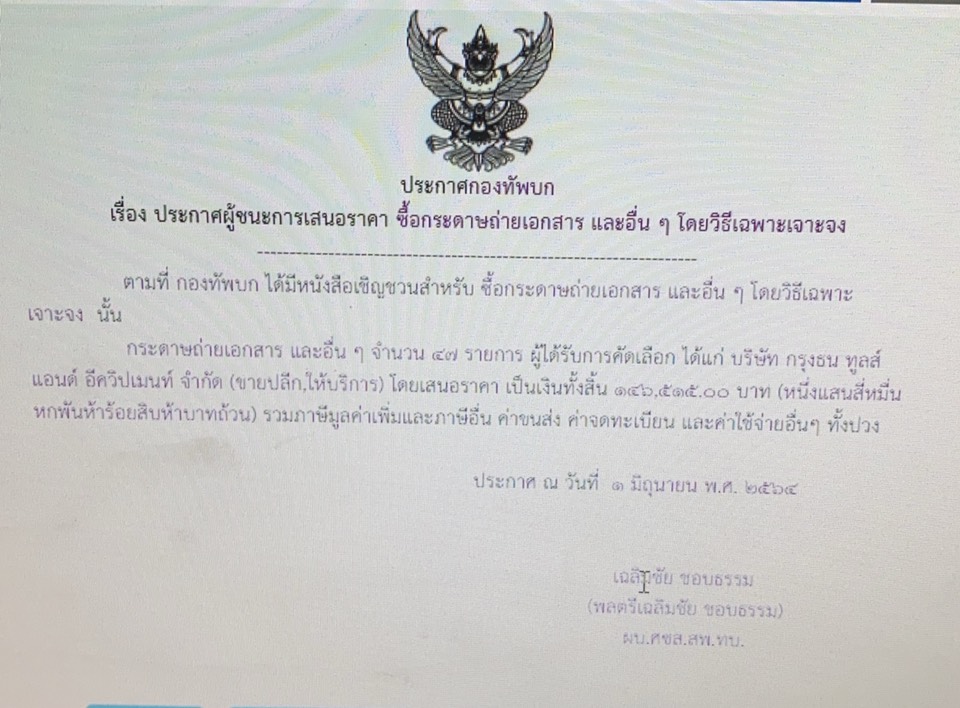 ตามที่ กองทัพบก ได้มีหนังสือเชิญชวนสำหรับ ซื้อกระดาษถ่ายเอกสาร และอื่น ๆ โดยวิธีเฉพาะเจาะจง นั้น
