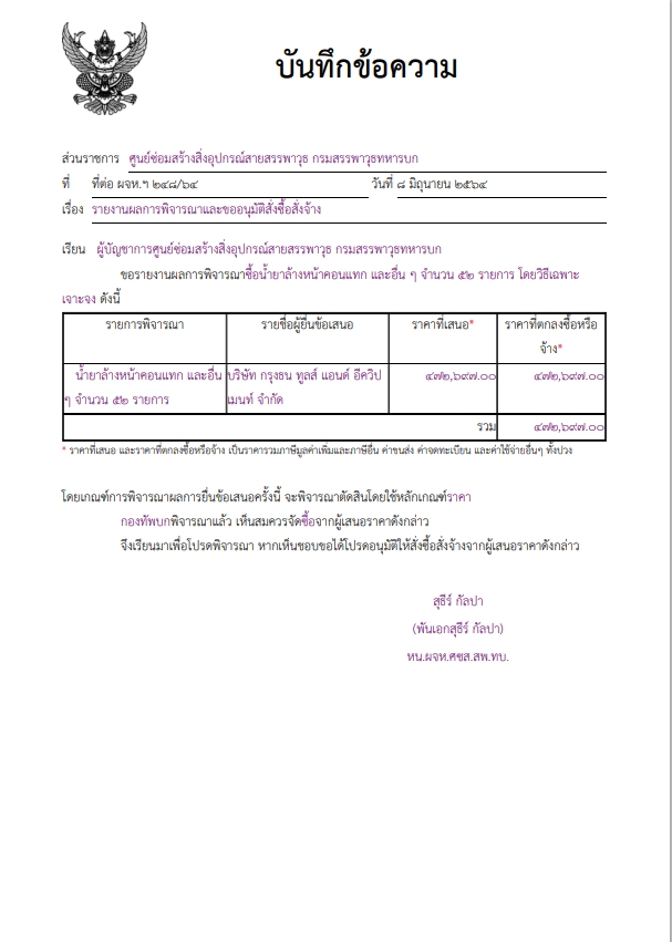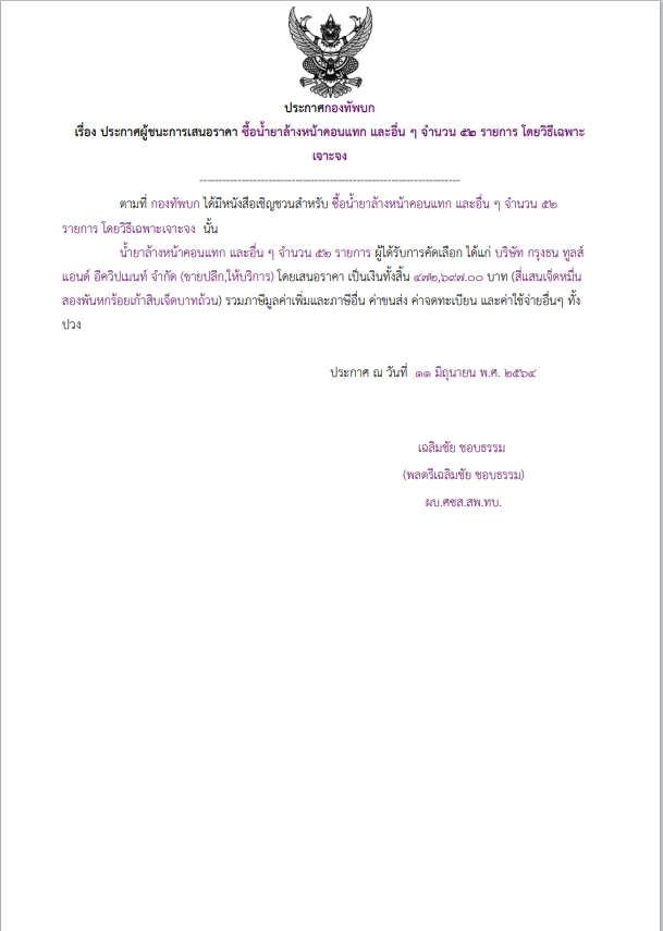 ตามที่ กองทัพบก ได้มีหนังสือเชิญชวนสำหรับ ซื้อน้ำยาล้างหน้าคอนแทก และอื่น ๆ จำนวน ๕๒ รายการ โดยวิธีเฉพาะเจาะจง นั้น