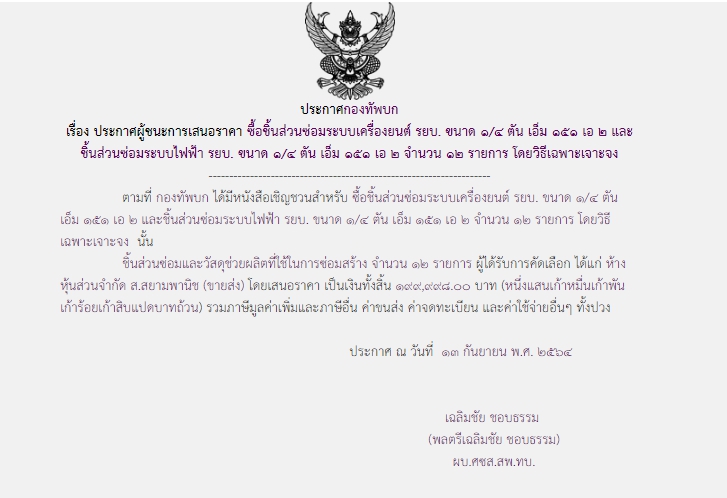 เรื่อง ประกาศผู้ชนะการเสนอราคา ซื้อชิ้นส่วนซ่อมระบบเครื่องยนต์ รยบ. ขนาด ๑/๔ ตัน เอ็ม ๑๕๑ เอ ๒ และชิ้นส่วนซ่อมระบบไฟฟ้า รยบ. ขนาด ๑/๔ ตัน เอ็ม ๑๕๑ เอ ๒ จำนวน ๑๒ รายการ โดยวิธีเฉพาะเจาะจง