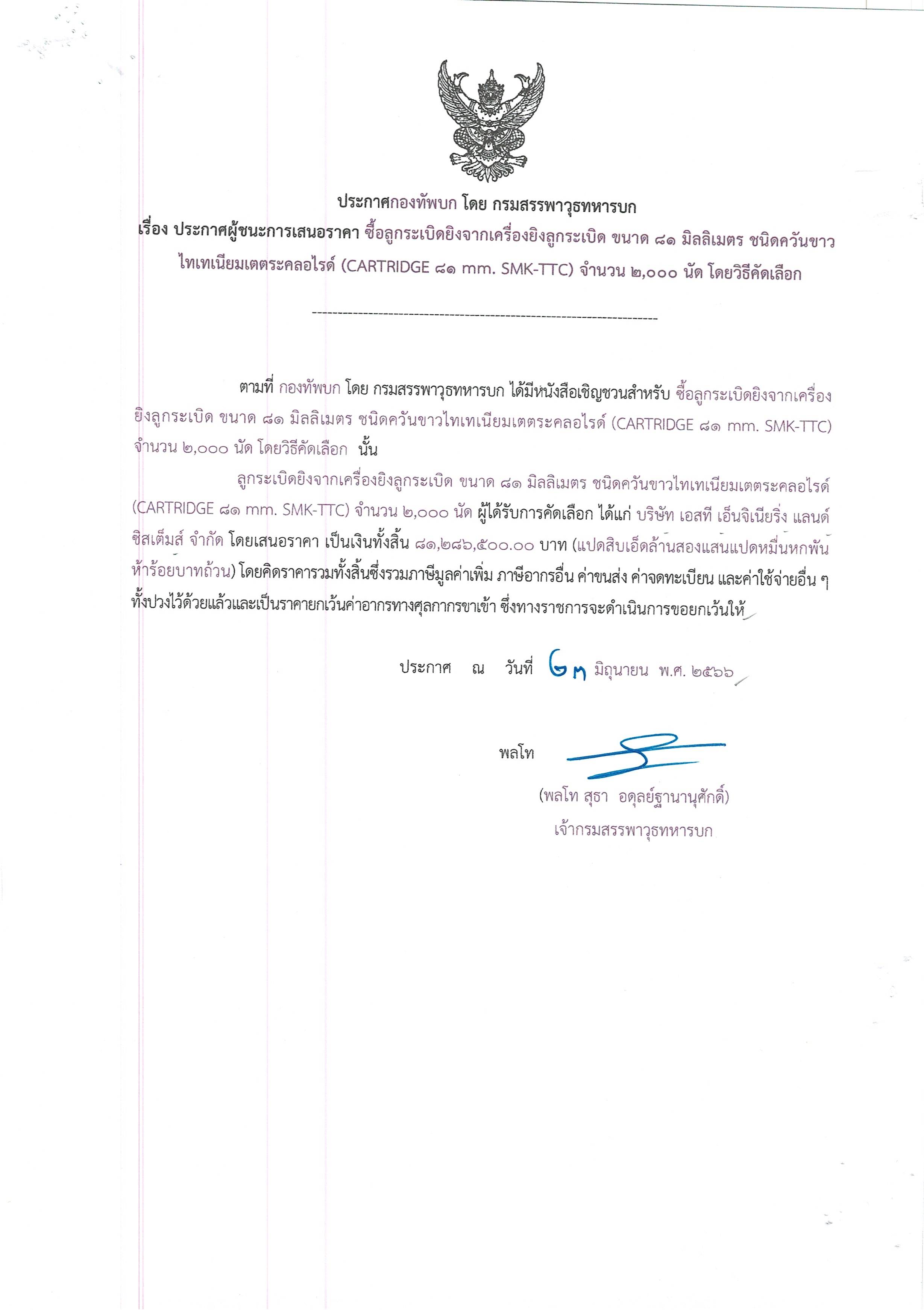 เรื่อง ประกาศผู้ชนะการเสนอราคา ซื้อลูกระเบิดยิงจากเครื่องยิงลูกระเบิด ขนาด ๘๑ มิลลิเมตร ชนิดควันขาวไทเทเนียมเตตระคลอไรด์ (CARTRIDGE ๘๑ mm. SMK-TTC) จำนวน ๒,๐๐๐ นัด โดยวิธีคัดเลือก