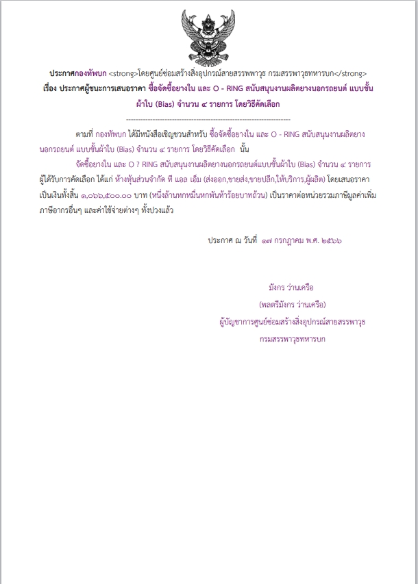 ตามที่ กองทัพบก โดยศูนย์ซ่อมสร้างสิ่งอุปกรณ์สายสรรพาวุธ กรมสรรพาวุธทหารบก ได้มีหนังสือเชิญชวนสำหรับ ซื้อจัดซื้อยางใน และ O - RING สนับสนุนงานผลิตยางนอกรถยนต์ แบบชั้นผ้าใบ (Bias) จำนวน ๔ รายการ โดยวิธีคัดเลือก นั้น