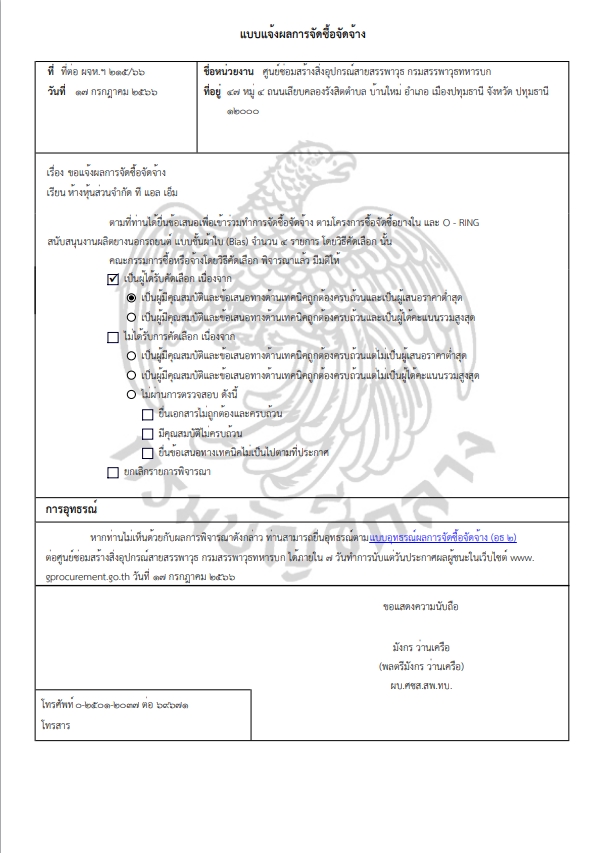 เรื่อง ประกาศผู้ชนะการเสนอราคา การจัดซื้อยางใน และ O – RING สนับสนุนงานผลิตยางนอกรถยนต์แบบชั้นผ้าใบ (Bias) จำนวน ๔ รายการ โดยวิธีคัดเลือก