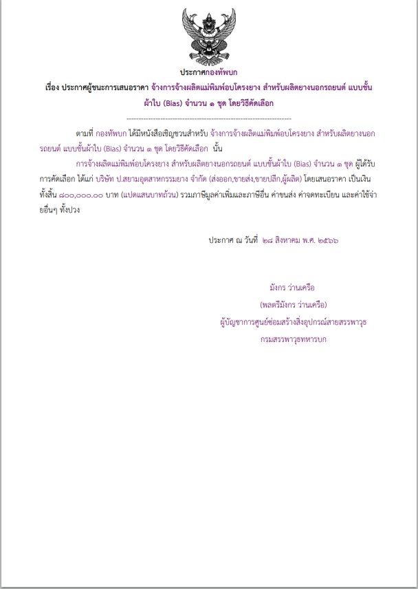 การจ้างผลิตแม่พิมพ์อบโครงยาง สำหรับผลิตยางนอกรถยนต์ แบบชั้นผ้าใบ (Bias) จำนวน ๑ ชุด ผู้ได้รับการคัดเลือก ได้แก่ บริษัท ป.สยามอุตสาหกรรมยาง จำกัด (ส่งออก,ขายส่ง,ขายปลีก,ผู้ผลิต) โดยเสนอราคา เป็นเงินทั้งสิ้น ๘๐๐,๐๐๐.๐๐ บาท (แปดแสนบาทถ้วน) รวมภาษีมูลค่าเพิ่มและภาษีอื่น ค่าขนส่ง ค่าจดทะเบียน และค่าใช้จ่ายอื่นๆ ทั้งปวง