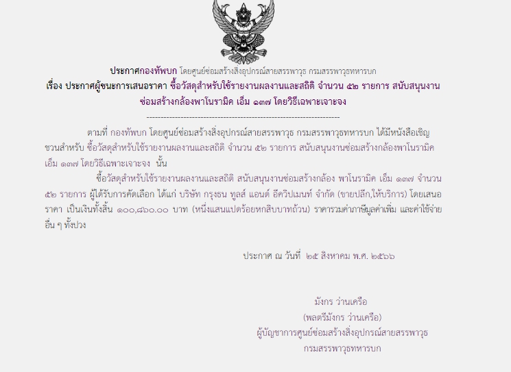 เรื่อง ประกาศผู้ชนะการเสนอราคา ซื้อวัสดุสำหรับใช้รายงานผลงานและสถิติ จำนวน ๕๒ รายการ สนับสนุนงานซ่อมสร้างกล้อง พาโนรามิค เอ็ม ๑๓๗ โดยวิธีเฉพาะเจาะจง