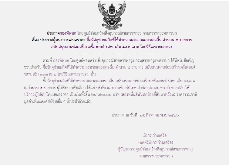 เรื่อง ประกาศผู้ชนะการเสนอราคา ซื้อวัสดุช่วยผลิตที่ใช้ทำความสะอาดและหล่อลื่น จำนวน ๕ รายการ สนับสนุนงานซ่อมสร้างเครื่องยนต์ รสพ. เอ็ม ๑๑๓ เอ ๒ โดยวิธีเฉพาะเจาะจง