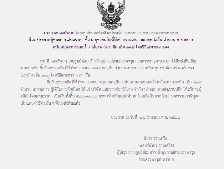 เรื่อง ประกาศผู้ชนะการเสนอราคาซื้อวัสดุช่วยผลิตที่ใช้ทำความสะอาดและหล่อลื่น จำนวน ๕ รายการ สนับสนุนงานซ่อมสร้างกล้องพาโนรามิค เอ็ม ๑๓๗ โดยวิธีเฉพาะเจาะจง