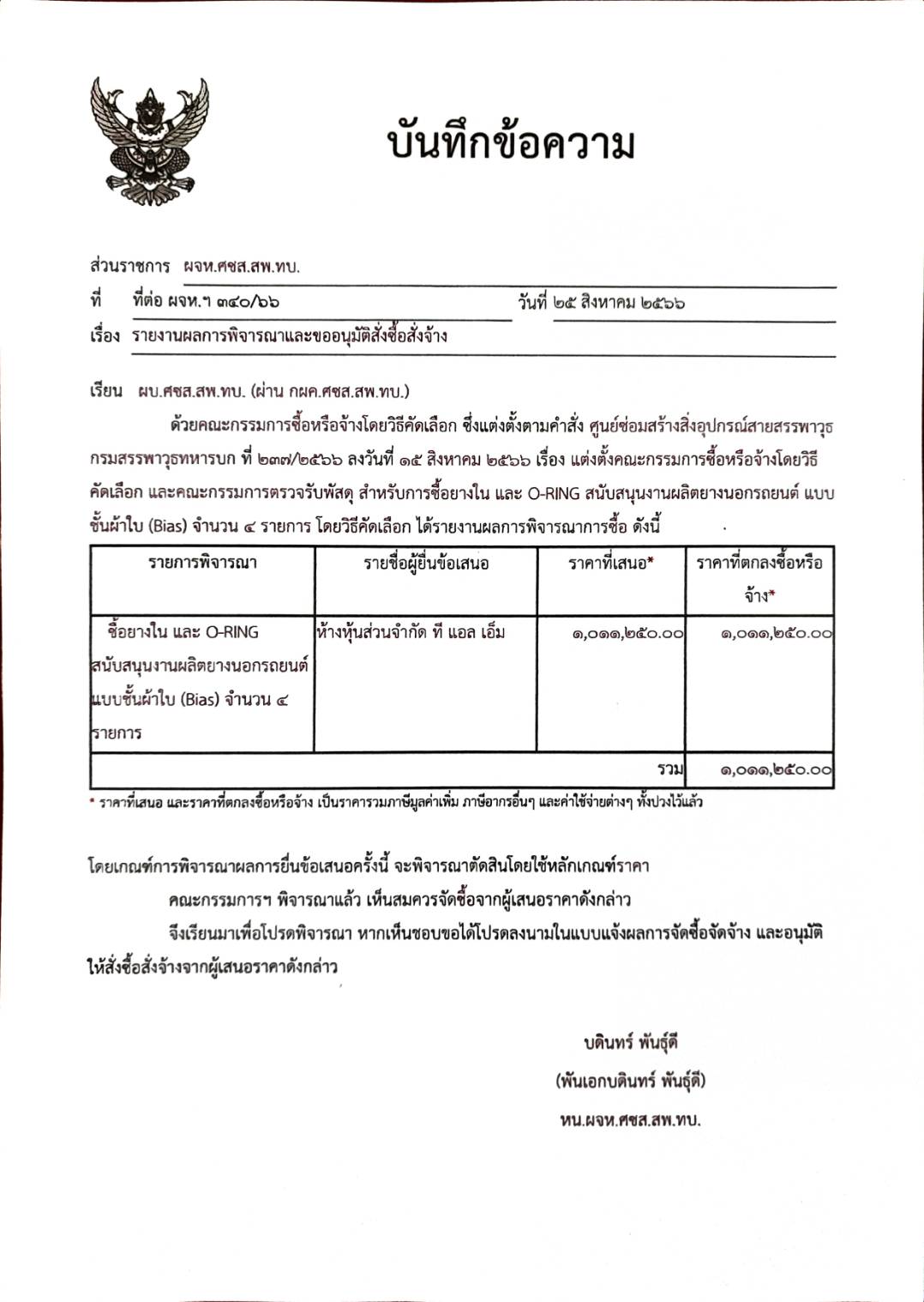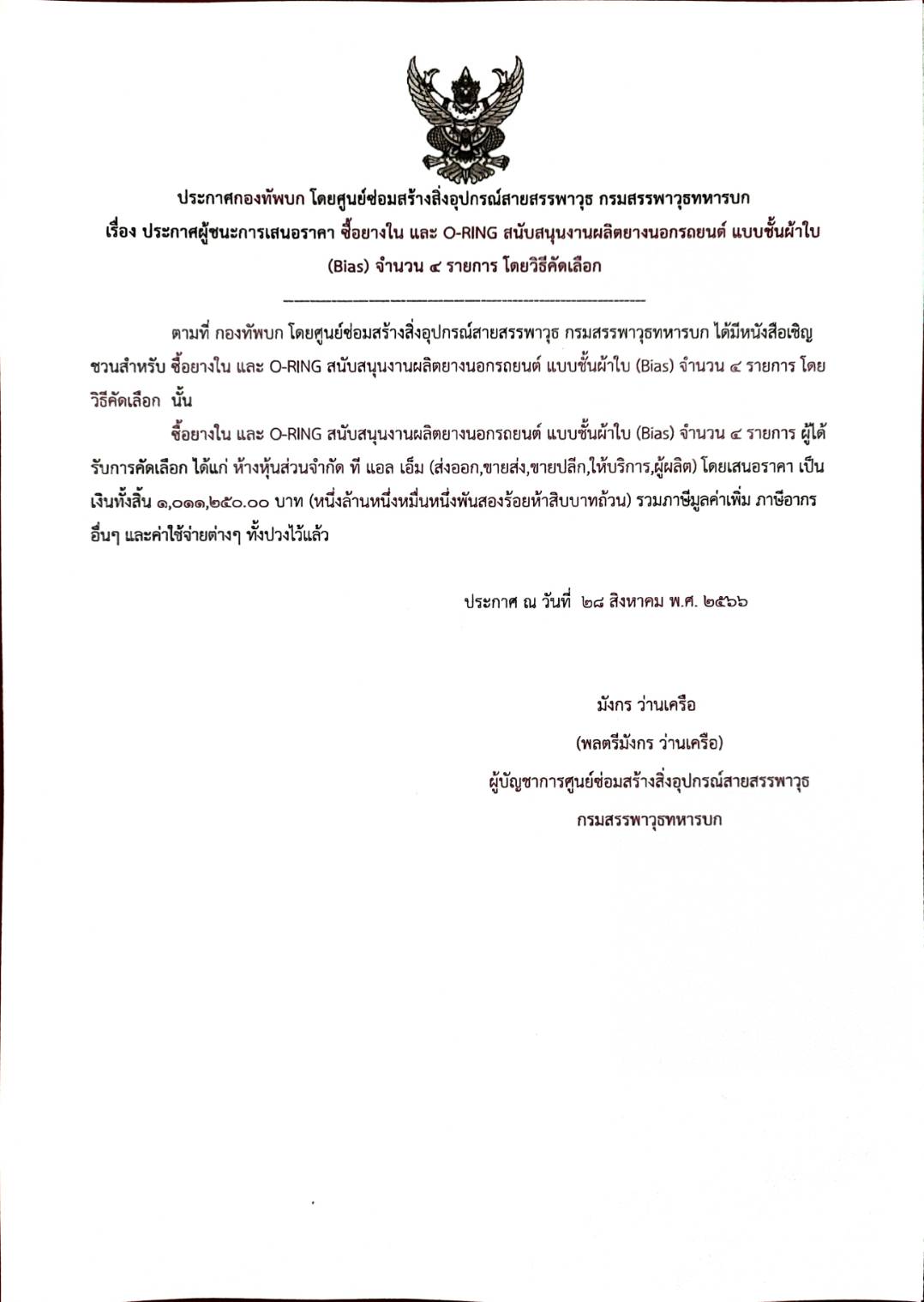 ซื้อยางใน และ O-RING สนับสนุนงานผลิตยางนอกรถยนต์ แบบชั้นผ้าใบ (Bias) จำนวน ๔ รายการ ผู้ได้รับการคัดเลือก ได้แก่ ห้างหุ้นส่วนจำกัด ที แอล เอ็ม (ส่งออก,ขายส่ง,ขายปลีก,ให้บริการ,ผู้ผลิต) โดยเสนอราคา เป็นเงินทั้งสิ้น ๑,๐๑๑,๒๕๐.๐๐ บาท (หนึ่งล้านหนึ่งหมื่นหนึ่งพันสองร้อยห้าสิบบาทถ้วน) รวมภาษีมูลค่าเพิ่ม ภาษีอากรอื่นๆ และค่าใช้จ่ายต่างๆ ทั้งปวงไว้แล้ว