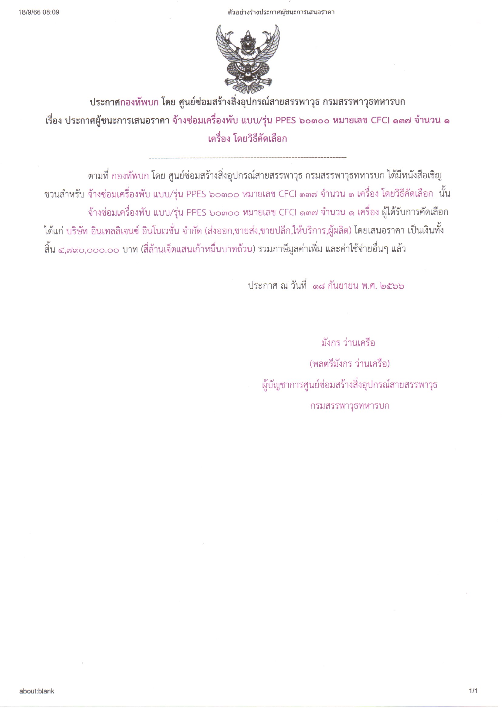 เรื่อง ประกาศผู้ชนะการเสนอราคา การจ้างซ่อม เครื่องพับ แบบ/รุ่น PPES 60300 หมายเลข CFCI 137 จำนวน ๑ เครื่อง