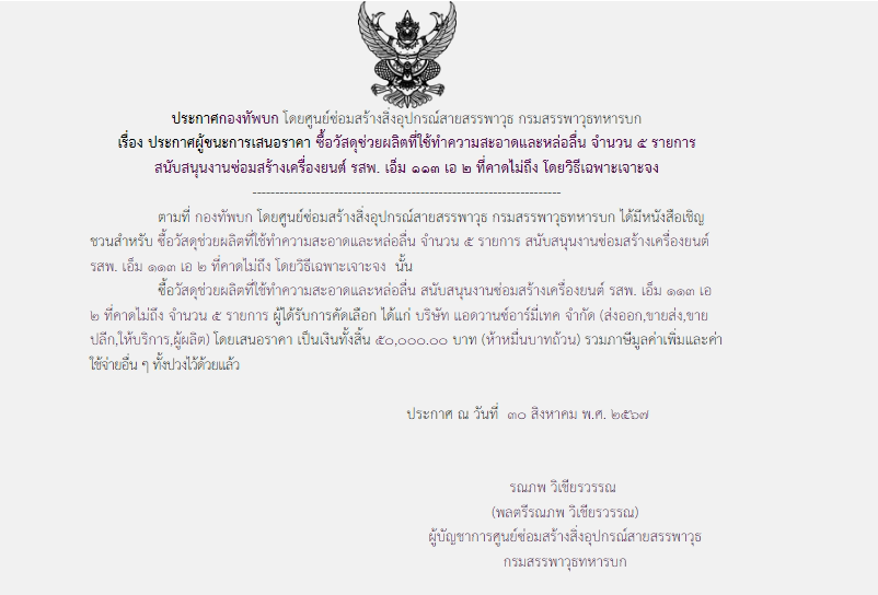 ตามที่ กองทัพบก โดยศูนย์ซ่อมสร้างสิ่งอุปกรณ์สายสรรพาวุธ กรมสรรพาวุธทหารบก ได้มีโครงการซื้อวัสดุช่วยผลิตที่ใช้ทำความสะอาดและหล่อลื่น จำนวน ๕ รายการ สนับสนุนงานซ่อมสร้างเครื่องยนต์ รสพ. เอ็ม ๑๑๓ เอ ๒ ที่คาดไม่ถึง โดยวิธีเฉพาะเจาะจง นั้น