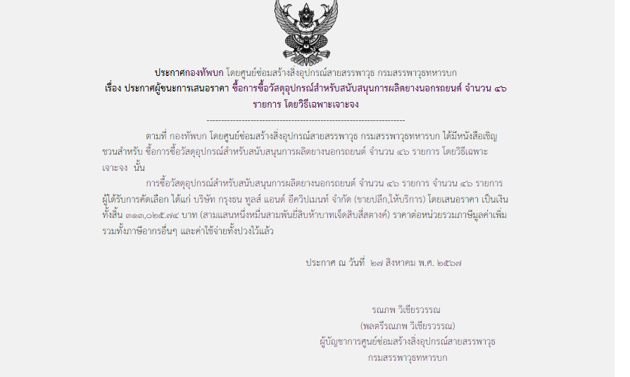 ตามที่ กองทัพบก โดยศูนย์ซ่อมสร้างสิ่งอุปกรณ์สายสรรพาวุธ กรมสรรพาวุธทหารบก ได้มีหนังสือเชิญชวนสำหรับ ซื้อการซื้อวัสดุอุปกรณ์สำหรับสนับสนุนการผลิตยางนอกรถยนต์ จำนวน ๔๖ รายการ โดยวิธีเฉพาะเจาะจง นั้น