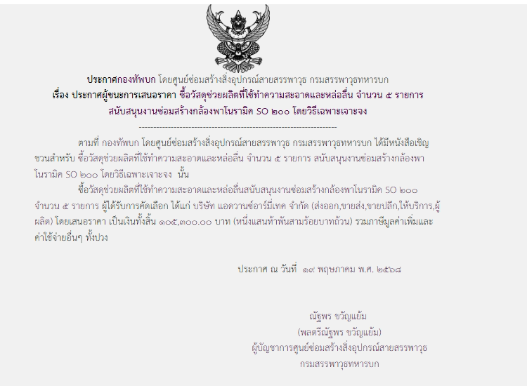 ตามที่ กองทัพบก โดยศูนย์ซ่อมสร้างสิ่งอุปกรณ์สายสรรพาวุธ กรมสรรพาวุธทหารบก ได้มีโครงการซื้อวัสดุช่วยผลิตที่ใช้ทำความสะอาดและหล่อลื่น จำนวน ๕ รายการ สนับสนุนงานซ่อมสร้างกล้องพาโนรามิค SO 200 โดยวิธีเฉพาะเจาะจง นั้น