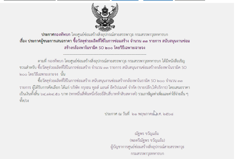 ตามที่ กองทัพบก โดยศูนย์ซ่อมสร้างสิ่งอุปกรณ์สายสรรพาวุธ กรมสรรพาวุธทหารบก ได้มีโครงการซื้อวัสดุช่วยผลิตที่ใช้ในการซ่อมสร้าง จำนวน ๓๓ รายการ สนับสนุนงานซ่อมสร้างกล้องพาโนรามิค SO 200โดยวิธีเฉพาะเจาะจง นั้น