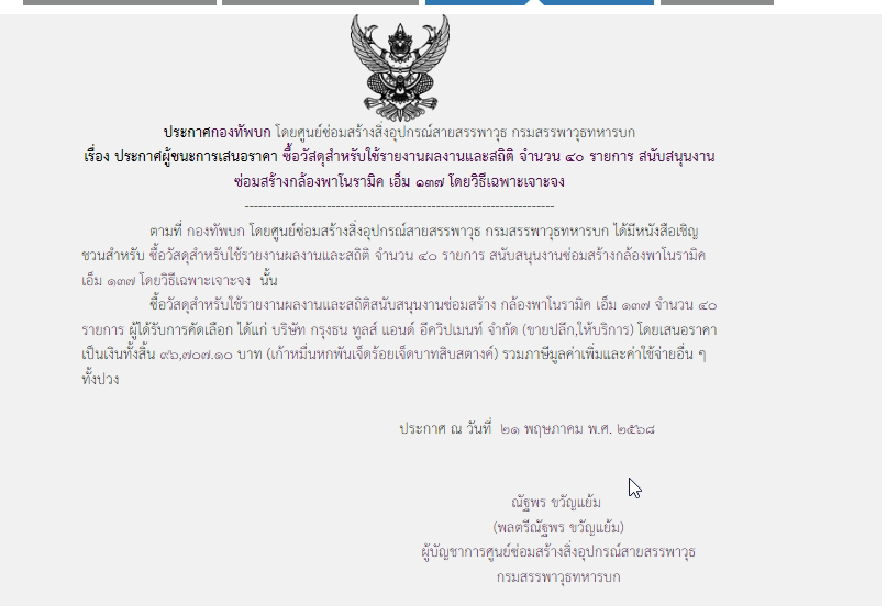 ซื้อวัสดุสำหรับใช้รายงานผลงานและสถิติ จำนวน ๔๐ รายการ สนับสนุนงานซ่อมสร้างกล้อง พาโนรามิค เอ็ม ๑๓๗ ผู้ได้รับการคัดเลือกได้แก่บริษัท กรุงธน ทูลส์ แอนด์ อีควิปเมนท์ จำกัด (ขายปลีก,ให้บริการ) โดยเสนอราคาเป็นเงิน ๙๖,๗๐๗.๑๐ บาท (เก้าหมื่นหกพันเจ็ดร้อยเจ็ดบาทสิบสตางค์) รวมภาษีมูลค่าเพิ่มและค่าใช้จ่ายอื่น ๆ ทั้งปวง