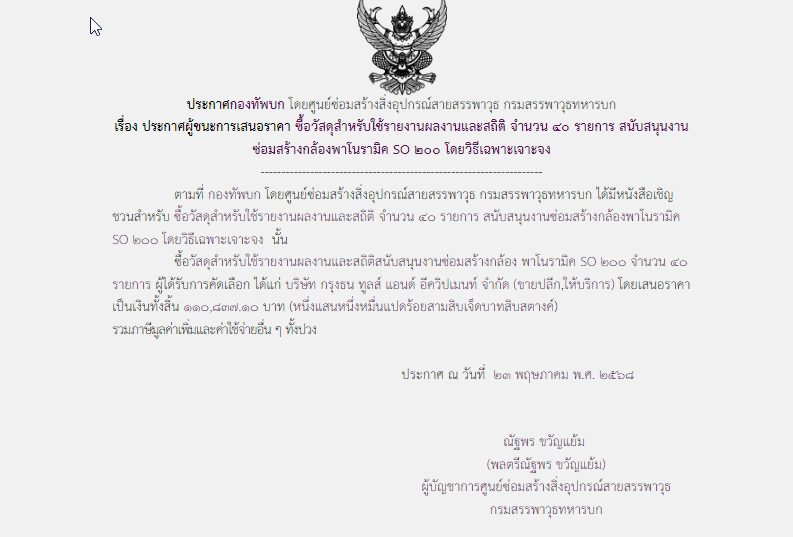 เรื่อง ประกาศผู้ชนะการเสนอราคาซื้อวัสดุสำหรับใช้รายงานผลงานและสถิติ จำนวน ๔๐ รายการ สนับสนุนงานซ่อมสร้างกล้องพาโนรามิค SO 200 โดยวิธีเฉพาะเจาะจง