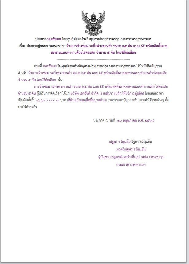 ตามที่ กองทัพบก โดยศูนย์ซ่อมสร้างสิ่งอุปกรณ์สายสรรพาวุธ กรมสรรพาวุธทหารบก ได้มีหนังสือเชิญชวนสำหรับ จ้างการจ้างซ่อม รถกึ่งพ่วงชานต่ำ ขนาด ๒๕ ตัน แบบ KE พร้อมติดตั้งลาดสะพานแบบทำงานด้วยไฮดรอลิก จำนวน ๕ คัน โดยวิธีคัดเลือก นั้น