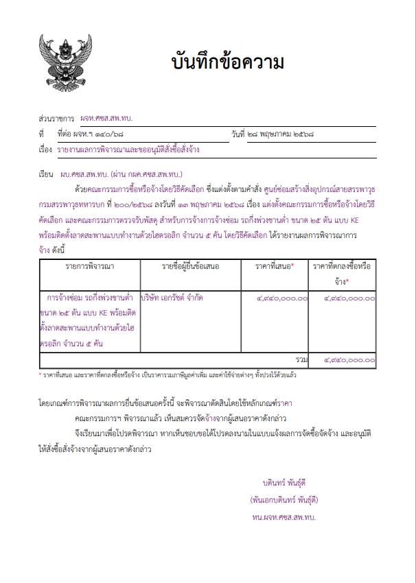 การจ้างซ่อม รถกึ่งพ่วงชานต่ำ ขนาด ๒๕ ตัน แบบ KE พร้อมติดตั้งลาดสะพานแบบทำงานด้วยไฮดรอลิก จำนวน ๕ คัน ผู้ได้รับการคัดเลือก ได้แก่ บริษัท เอกรัชต์ จำกัด (ขายส่ง,ขายปลีก,ให้บริการ,ผู้ผลิต) โดยเสนอราคา เป็นเงินทั้งสิ้น ๔,๙๔๐,๐๐๐.๐๐ บาท (สี่ล้านเก้าแสนสี่หมื่นบาทถ้วน) ราคารวมภาษีมูลค่าเพิ่ม และค่าใช้จ่ายต่างๆ ทั้งปวงไว้ด้วยแล้ว