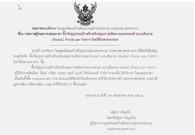 ตามที่ กองทัพบก โดยศูนย์ซ่อมสร้างสิ่งอุปกรณ์สายสรรพาวุธ กรมสรรพาวุธทหารบก ได้มีโครงการซื้อวัสดุอุปกรณ์สำหรับสนับสนุนการผลิตยางนอกรถยนต์ แบบเส้นลวด (Radial) จำนวน ๔๗ รายการ โดยวิธีเฉพาะเจาะจง นั้น