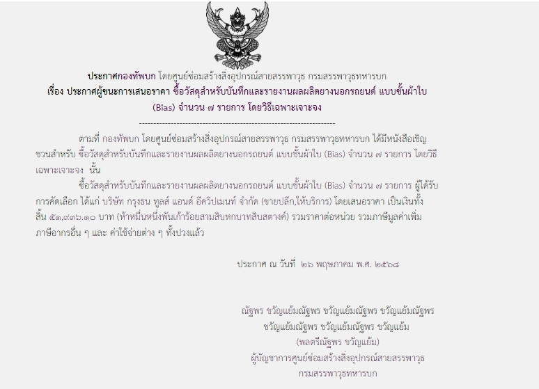 ตามที่ กองทัพบก โดยศูนย์ซ่อมสร้างสิ่งอุปกรณ์สายสรรพาวุธ กรมสรรพาวุธทหารบก ได้มีโครงการซื้อวัสดุสำหรับบันทึกและรายงานผลผลิตยางนอกรถยนต์ แบบชั้นผ้าใบ (Bias) จำนวน ๗ รายการ โดยวิธีเฉพาะเจาะจง นั้น