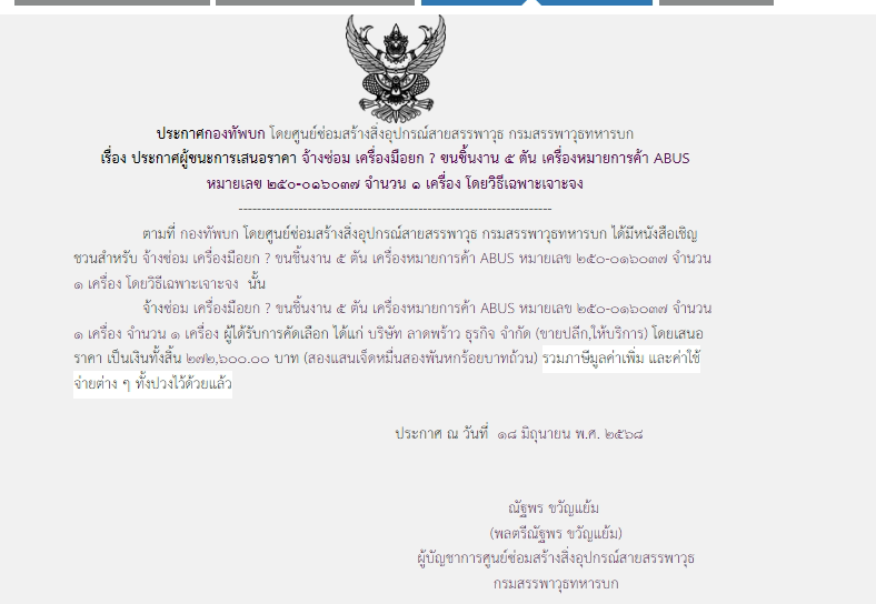 ตามที่ กองทัพบก โดยศูนย์ซ่อมสร้างสิ่งอุปกรณ์สายสรรพาวุธ กรมสรรพาวุธทหารบก ได้มีหนังสือเชิญชวนสำหรับจ้างซ่อม เครื่องมือยก – ขนชิ้นงาน ๕ ตัน เครื่องหมายการค้า ABUS หมายเลข ๒๕๐-๐๑๖๐๓๗ จำนวน ๑ เครื่อง โดยวิธีเฉพาะเจาะจง นั้น