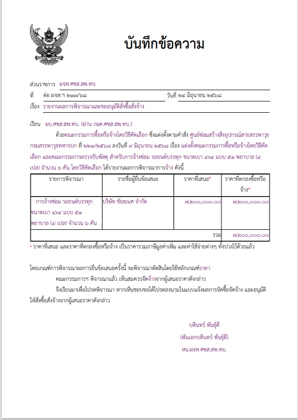 การจ้างซ่อม รถยนต์บรรทุก ขนาดเบา ๔x๔ แบบ ๕๑ พยาบาล (๔ เปล) จำนวน ๖ คัน ผู้ได้รับการคัดเลือก ได้แก่ บริษัท ชัยธเนศ จำกัด (ส่งออก,ขายส่ง,ขายปลีก,ผู้ผลิต) โดยเสนอราคา เป็นเงินทั้งสิ้น ๗,๒๐๐,๐๐๐.๐๐ บาท (เจ็ดล้านสองแสนบาทถ้วน) รวมภาษีมูลค่าเพิ่ม และค่าใช้จ่ายต่างๆ ทั้งปวงไว้ด้วยแล้ว