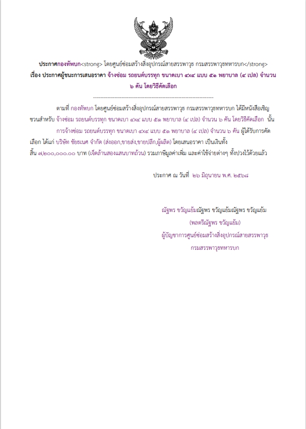 เรื่อง ประกาศผู้ชนะการเสนอราคาจ้างซ่อม รถยนต์บรรทุก ขนาดเบา ๔x๔ แบบ ๕๑ พยาบาล (๔ เปล) จำนวน ๖ คัน โดยวิธีคัดเลือก