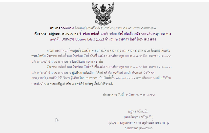 ตามที่ กองทัพบก โดยศูนย์ซ่อมสร้างสิ่งอุปกรณ์สายสรรพาวุธ กรมสรรพาวุธทหารบก ได้มีหนังสือเชิญชวนสำหรับจ้างซ่อม หม้อน้ำและจ้างซ่อม ถังน้ำมันเชื้อเพลิง รถยนต์บรรทุก ขนาด ๑ ๑/๔ ตัน UNIMOG U1100 L/29 (4x4) จำนวน ๒ รายการ โดยวิธีเฉพาะเจาะจง นั้น