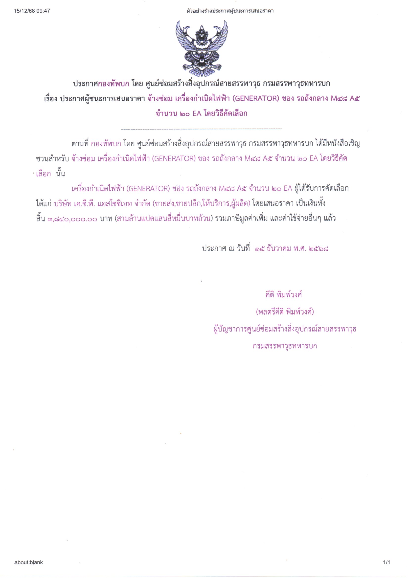การจ้างซ่อมเครื่องกำเนิดไฟฟ้า (GENERATOR) ของ รถถังกลาง M48 A5 จำนวน 20 EA ผู้ได้รับการคัดเลือกได้แก่บริษัท เค.ซี.พี. แอสโซซิเอท จำกัด (ขายส่ง,ขายปลีก,ให้บริการ,ผู้ผลิต) โดยเสนอราคาเป็นเงินทั้งสิ้น ๓,๘๔๐,๐๐๐.- บาท (สามล้านแปดแสนสี่หมื่นบาทถ้วน) รวมภาษีมูลค่าเพิ่ม และค่าใช้จ่ายอื่นๆ แล้ว