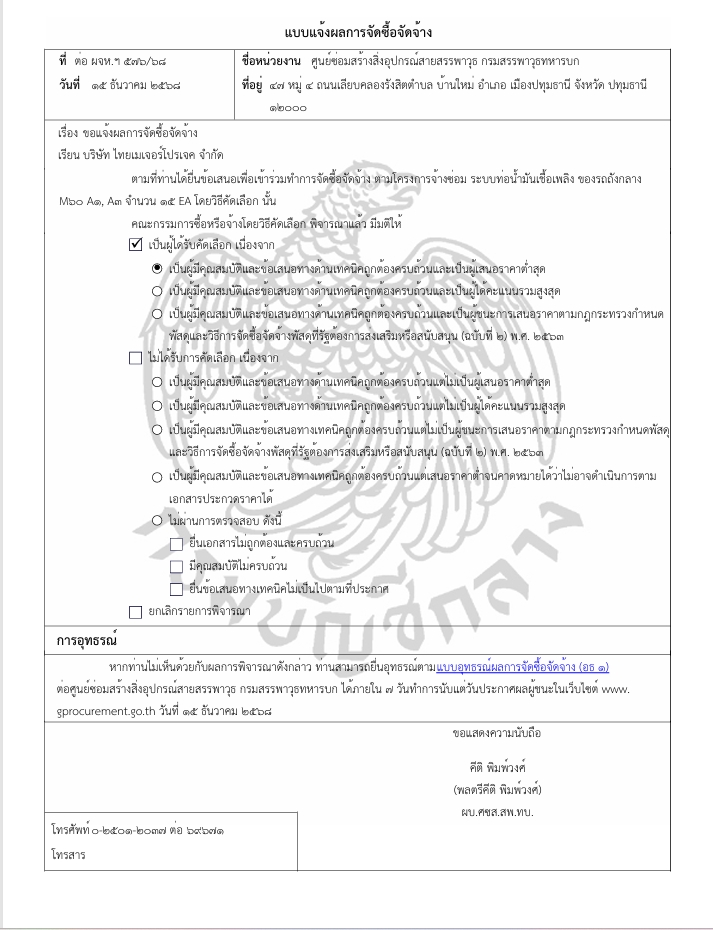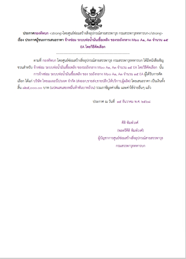 การจ้างซ่อม ระบบท่อน้ำมันเชื้อเพลิง ของ รถถังกลาง M๖๐ A๑, A๓ จำนวน ๑๕ EA ผู้ได้รับการคัดเลือก ได้แก่ บริษัท ไทยเมเจอร์โปรเจค จำกัด (ส่งออก,ขายส่ง,ขายปลีก,ให้บริการ,ผู้ผลิต) โดยเสนอราคา เป็นเงินทั้งสิ้น ๘๒๕,๐๐๐.๐๐ บาท (แปดแสนสองหมื่นห้าพันบาทถ้วน) รวมภาษีมูลค่าเพิ่ม และค่าใช้จ่ายอื่นๆ แล้ว