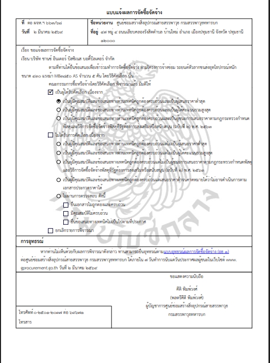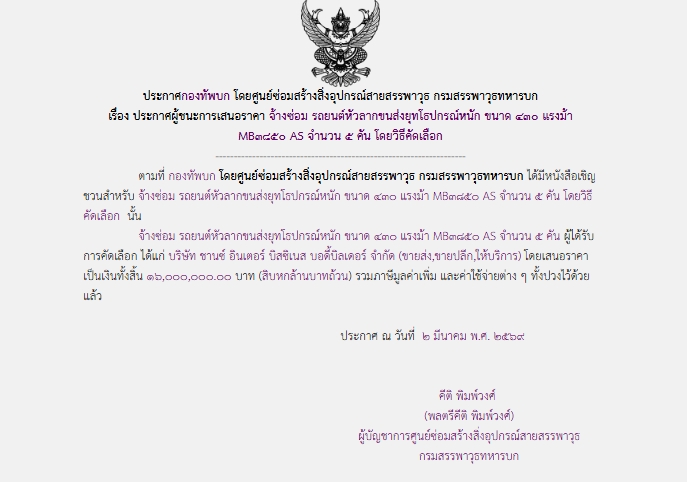 ตามที่ กองทัพบก โดยศูนย์ซ่อมสร้างสิ่งอุปกรณ์สายสรรพาวุธ กรมสรรพาวุธทหารบก ได้มีโครงการ จ้างซ่อม รถยนต์หัวลากขนส่งยุทโธปกรณ์หนัก ขนาด ๔๓๐ แรงม้า MB3850 AS จำนวน ๕ คัน โดยวิธีคัดเลือก นั้น