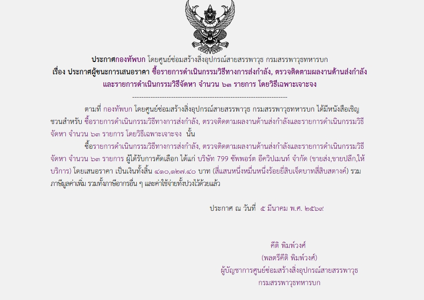 ซื้อรายการดำเนินกรรมวิธีทางการส่งกำลัง, ตรวจติดตามผลงานด้านส่งกำลังและการดำเนินกรรม วิธีจัดหา จำนวน ๖๓ รายการ ผู้ได้รับการคัดเลือกได้แก่บริษัท 799 ซัพพอร์ต อีควิปเมนท์ จำกัด (ขายส่ง, ขายปลีก,ให้บริการ) โดยเสนอราคาเป็นเงินทั้งสิ้น ๔๑๐,๑๒๗.๔๐ บาท (สี่แสนหนึ่งหมื่นหนึ่งร้อยยี่สิบเจ็ดบาท สี่สิบสตางค์) รวมภาษีมูลค่าเพิ่ม รวมทั้งภาษีอากรอื่น ๆ และค่าใช้จ่ายทั้งปวงไว้ด้วยแล้ว